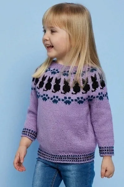Вязать рисунок по схеме кошек, повторяя раппорт рисунка 18 (18, 21, 24, 24, 24, 27) раз в ряду – на спицах 162 (162, 189, 216, 216, 216, 143) петли.