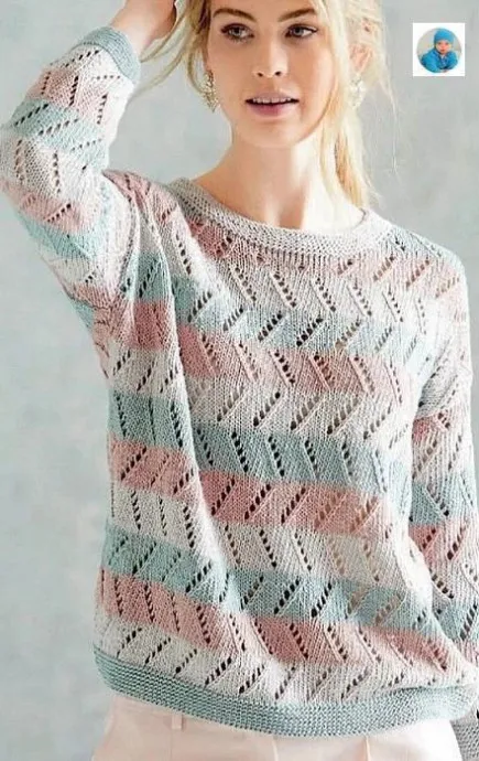 Одновременно для боковых скосов в каждом 2-м ряду от наборного края по обеим сторонам прибавить 5 х 1 п. = 100 107) 114 петель. Далее работу продолжить дырчатым узором согласно последовательности полос.