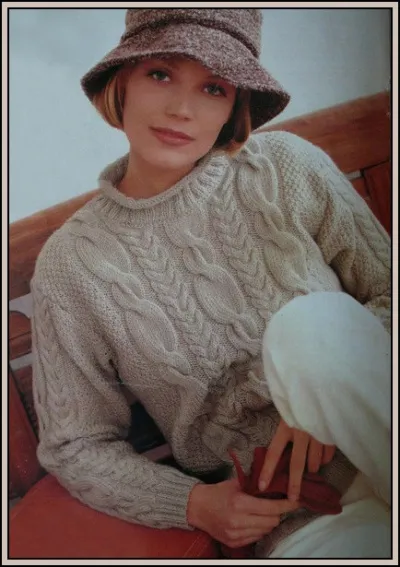 Рукава: набрать 54 (58) 62 п. и вязать 6 см. резинкой, при этом в последнем ряду равномерно прибавить 20 п. = 74 (78) 83 п. Далее вязать следующим образом: кром. 12 (14) 16 п. крупного жемчужного узора, 48 п. узора из "кос" (1 раппорт и с 1-й по 18-ю п. раппорта), 12 (14) 16 п. крупного жемчужного узора, кром. Для скосов прибавить с обеих сторон в каждом 6-м р.19 х1 п. = 112 (116) 120 п. Прибавленные петли вязать крупным жемчужным узором. На высоте 45 см. закрыть с обеих сторон для оката 1 х 4 п., затем в каждом 2-м р. 2 х 3; 5 х 2; 2 х 3 и 2 х 4 п., затем закрыть оставшиеся петли. Второй рукав вязать аналогично.