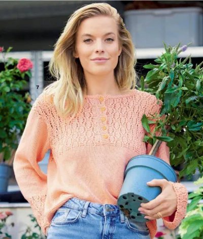 Классический пуловер с ажурной отделкой и застежкой поло связан спицами из хлопка абрикосового цвета.
