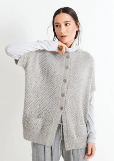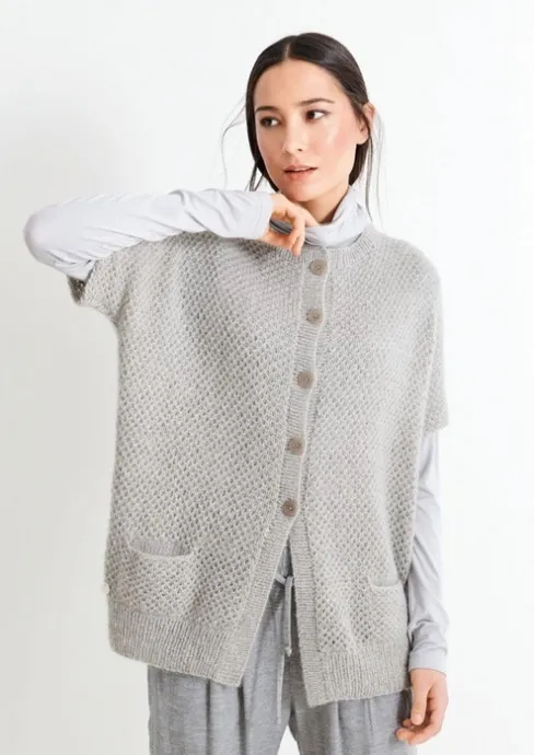 Вам потребуется: 150 (175) 200 г жемчужно-белой пряжи Silkhаir (70% мохера, 30% шёлка,;210 м/25 г) Lаnа Grоssа и 250 (300) 350 г светло-серой пряжи Lасе Sеtа (70% альпака, 30% шёлка; 250 м/50 г) Lаnа Grоssа; спицы № 3,5, 4 и 5; для закрывания петель по-итальянски – круговые спицы № 3 и 1 игла с тупым концом; 5 пуговиц.