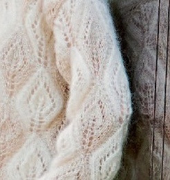 Вам потребуется: пряжа 1 (77% мохера, 23% шелка; 175 м/25 г)-225 г сливочно-белой; пряжа 2 (71% переработанного полиэстера, 29% полиэстера, 135 м/ 25 г) — 75 г золотисто-белой; спицы № 4,5- и 5,5; короткие круговые спицы №4,5.