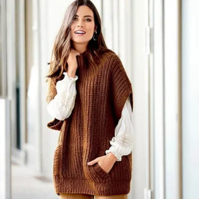 Длинная, теплая безрукавка с карманами и воротником гольф