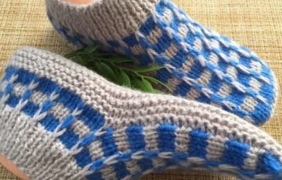 Я буду вязать следки на 37 — 38 размер ноги. Пряжа у меня Кавказская, спицы №2,5 , плотность вязания средняя. Я использую пряжу для основного цвета серую, и пряжу синего цвета для полосок.