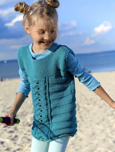 Широкая полоса ажурного узора украшает эту тунику, которую можно носить и в холодный сезон, вместо безрукавки.