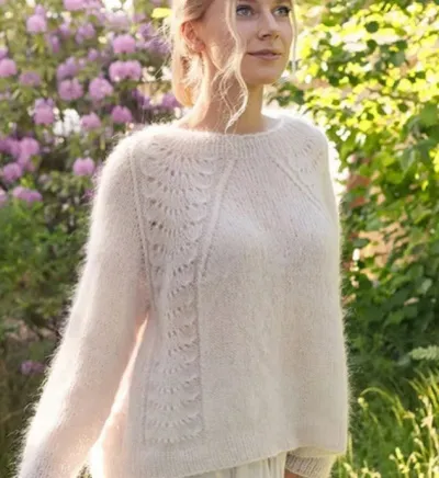 Джемпер выполнен в 2 нити пряжи DROPS Kid-Silk. Изделие вяжется сверху вниз регланом с ажурным узором. Размеры S - XXXL.