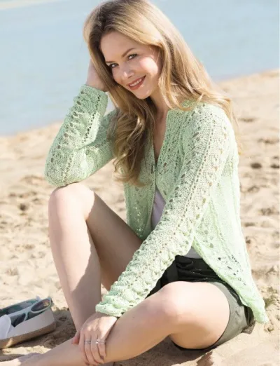 Все края обвязать 1 круговым рядом ст. б/н и «рачьим шагом» (= ст. б/н выполнять в направлении слева направо). Кардиган застегнуть на булавку.