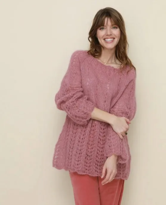 ВАМ ПОТРЕБУЕТСЯ Пряжа Phildar «Phil Mohair Soie Lurex» (78% мохера, 14% шелка, 4% полиамида, 4% полиэстера; 200 м/25 г) по 8 -8-9-9-10 мотков по 25 г розового цвета