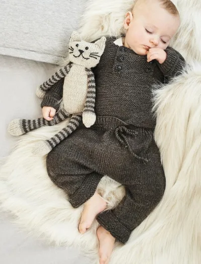 ВАМ ПОТРЕБУЕТСЯ: Пряжа Rico Design Baby Classic Dk (50% акрила, 50% полиамида; 165 м/ 50 г) — 2 (2) 3 (4) мотка меланжевой коричневой (№ 065) для пуловера и 2 (2) 3 (4) мотка для штанишек; спицы № 3,5 и 4; эластичный шнурок для пояса; булавки для снятия петель.