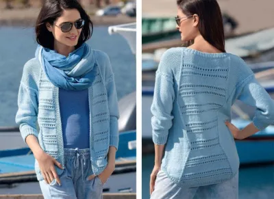 Пряжа (52% овечьей шерсти, 48% хлопка; 120 м/ 50 г) – 450 (550) 600 г голубой; спицы №4 и 4,5; пара круговых спиц №4 длиной по 100 см.