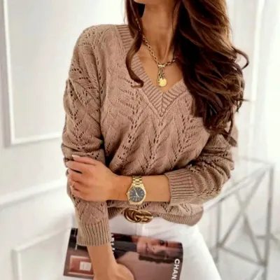 Прямой фасон до бедер, спущенная линия плеча, длинные рукава, плавно зауженные к резинке-манжете и глубокий V-образный вырез горловины.