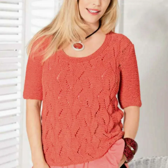 Элегантный коралловый пуловер спицами. Прямой фасон до пояса, втачной рукав выше локтя и широкий круглый вырез горловины. Основная часть изделия связана ажурным узором, а рукавчики фактурной платочной вязкой. Горловина также отделана платочкой.