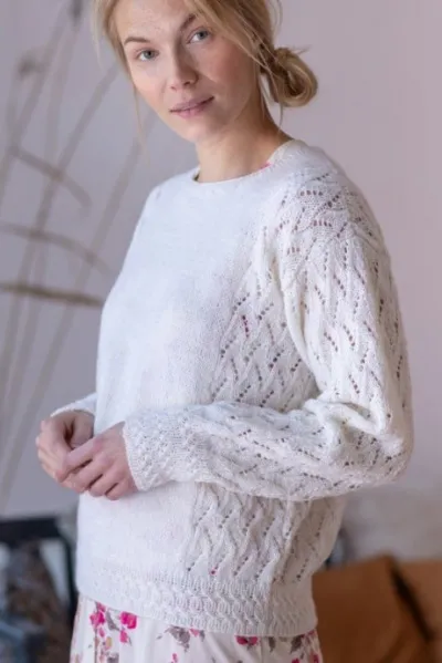 Материалы: пряжа Novita Nalle (75% шерсть, 25% полиамид, 100 г/260 м) 4-5-5-6-6 мотков белого цвета, спицы круговые 2.5 мм и 3.5 мм, а также круговые спицы 3 мм для воротника