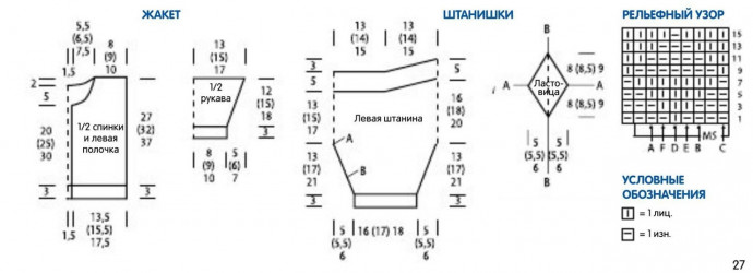 Плотность вязания. Рельефный узор, спицы №4,5: 2,05 п. и 31 р. = 10 х 10 см; лиц. гладь, спицы № 4,5: 20 п. и 30 р. = 10 х 10 см.