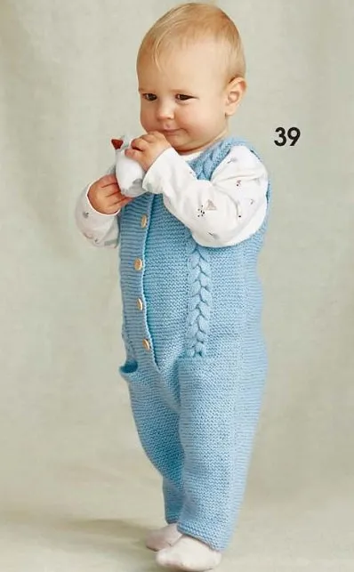 Оденьте своего малыша в удобный длинный комбинезон, связанный простой платочной вязкой. Передняя часть модели дополнена оригинальными деталями: двумя крупными «косами» и двумя потайными кармашками. Предусмотрена также застежка на пуговицы для наибольшего комфорта