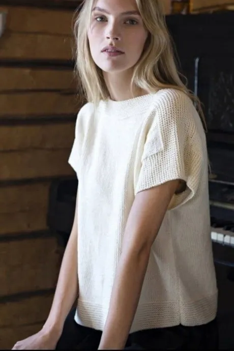 Набрать 104 (114) 122 (132) 140 (148) п. и провязать 6 см платочным узором, далее продолжить чулочной вязкой на высоту 28 (29) 30 (31) 34 (36) см от наборного края. В последнем ряду закрыть по 1 п. в начале след. 2-х рядов = 102 (112) 120 (130) 138 (146) п. Далее для рукавов набрать новые 15 в конце след. 2-х рядов = 132 (142) 150 (160) 168 (176) п. Продолжить вязание платочным узором на петлях рукавов, остальные петли — чулочной вязкой. Через 18 (19) 20 (21) 21 (22) см от начала вязания пройм рукавов продолжить вязание платочным узором на всех петлях на высоту 5 см. В след. лиц.р. для выреза горловины провязать первые 42 (47) 51 (54) 58 (62) п. плеча, закрыть след. 48 (48) 48 (52) 52 (52) п. выреза горловины, закончить ряд. В след. изн.р. набрать новые 48 (48) 48 (52) 52 (52) п. над закрытыми петлями. Провязать еще 5 см платочным узором. Продолжить вязание платочным узором на петлях рукавов, остальные петли — чулочной вязкой. Через 23 (24) 25 (26) 26 (27) см от воротника закрыть 15 п. в начале след. 2-х рядов = 102 (112) 120 (130) 138 (146) п. Продолжить вязание чулочной вязкой, при этом в начале след. 2-х рядов набрать по 1 петле = 104 (114) 122 (132) 140 (148) п. Через 22 (23) 24 (25) 28 (30) см от воротника продолжить платочным узором, когда будет связано 6 см, закрыть все петли.