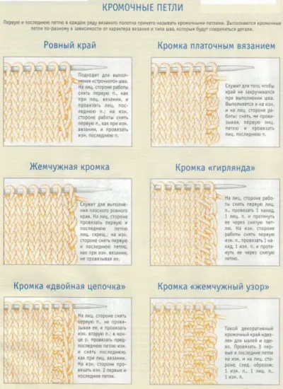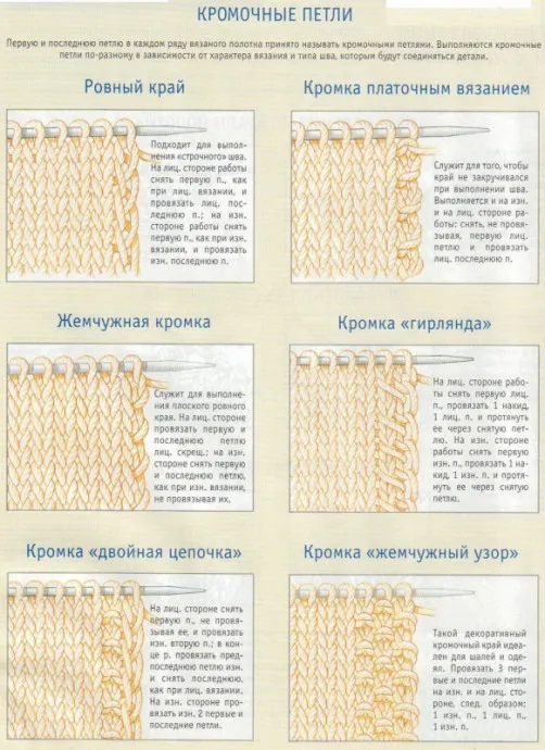 Первая и последняя петли провязываются в каждом ряду в соответствии с основным узором. Способ дает особенно хороший результат, когда важна не столько ровность края и сама кромочная, сколько петля ПОСЛЕ кромочной, например, если кромка уйдет в шов или будет набираться планка.