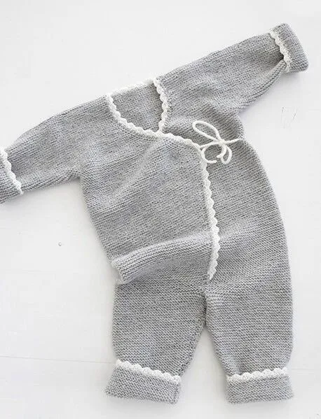 Для целого комплекта вам потребуется: пряжа DROPS BABYMERINO от Garnstudio 250-250-250 (300) г цвет 22, светло-серый; 100-100-100 (100) г цвет 02, натуральный; чулочные и круговые спицы № 3 мм; спицы № 2.5 мм – для кромок платочной вязкой; крючок № 2.5 мм.