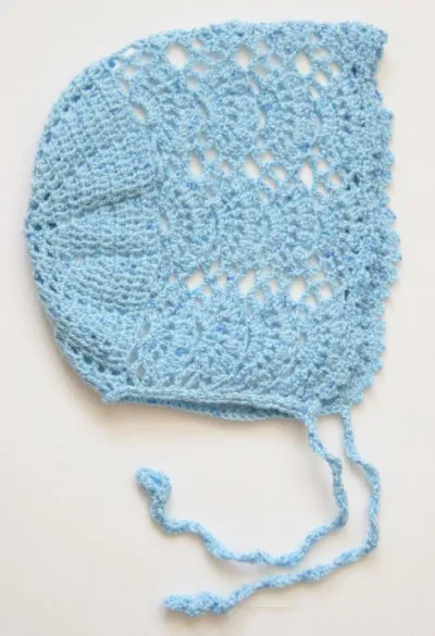 Сделать завязки: выполнить цепочку из 40 в. п., затем вязать цепочку по нижнему краю чепчика ( =50 в.п), продолжить цепочку из 40 в. п. для второго конца завязки.