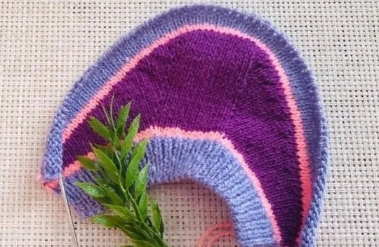 Далее я меняю цвета нити и буду вязать полоски лицевой гладью без прибавлений все петли имеющиеся на спицах. Всего нужно связать 6 рядов