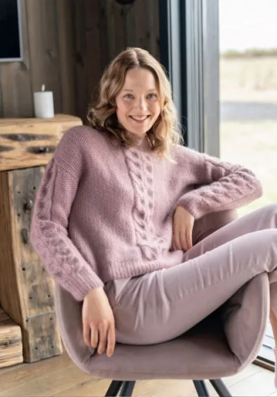 Мягкий пуловер связан мелким жемчужным узором и полосами ажурных «листьев» из роскошной кашемировой пряжи благородного пудрового тона.
