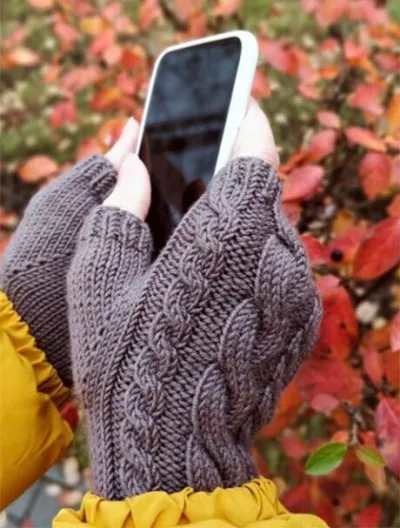 На малых косах перехлест через 5 рядов, на большой – через 10. Направление перехлеста может быть любым – на второй митенке не забудьте сделать симметрично.