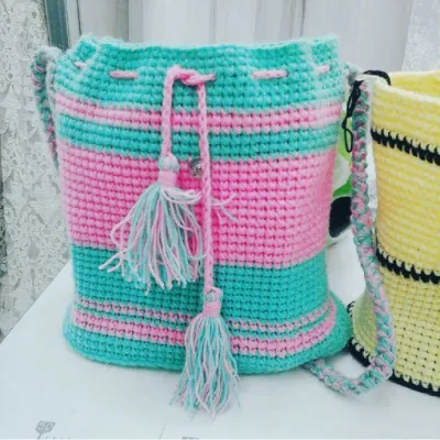 Вот такой рюкзачок связала для себя, желто-черный вязала на заказ. Пряжа иранский акрил, вязала в две нити. Пряжа очень хороша в эксплуатации. Огромный выбор цветов, не тускнеет и не линяет. Внутри есть 3 больших отделения, одно под замком и есть маленький кармашек под замочком.