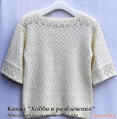 Горловина. В центре отложить на дополнительную спицу 47 петель. Плечи = 29 петель. Вязать прямо. Скос плеча вязать на высоте 66 ряда от начала проймы. Убавить по 5 петель х 3 раза. Закрыть ряд.
