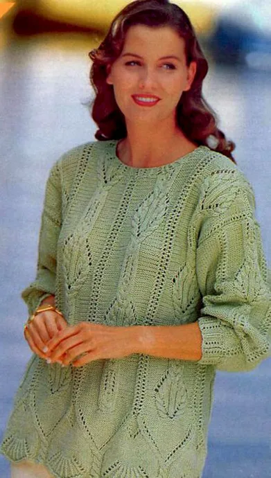 Сборка Выполнить плечевые швы. По краю горловины набрать на круговые спицы соответствующее количество п. и, связав 2 см планки 1, все п. закрыть. Рукава сложить пополам и вшить. Выполнить остальные швы.