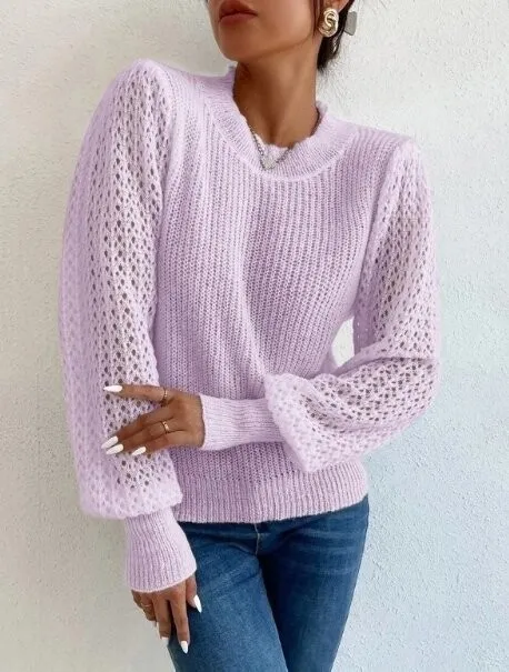 Лёгкая в восприятии, но эффектная модель. Из узоров: резинка 1 х 1, которой выполнены нижняя планка и манжеты рукавов, патентный узор переда и спинки, и ажурный узор рукавов. Собственно, благодаря им пуловер выглядит столь романтично.