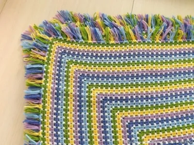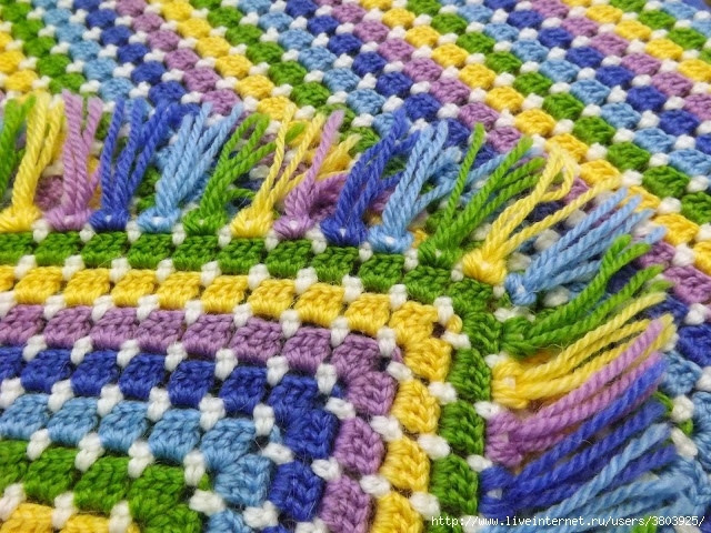 Последний ряд я сделала белый, чтобы под арки из воздушных петель зацепить разноцветные кисти. Вуаля, плед готов!