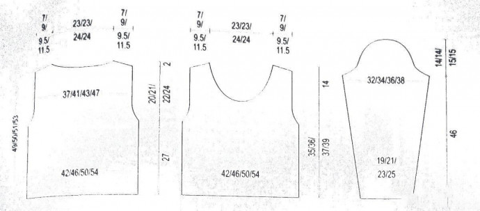 Вырез горловины. На высоте 35 / 36 / 37 / 39 см от наборного края закрыть средние 24 / 24 / 28 / 28 петель и с обеих сторон в каждом 2-м ряду еще 1 раз по 4 петли, 1 раз по 3 петли, 1 раз по 2 петли, убавить внутри ряда 12 раз по 1 петле (смотрите Примечание 2).