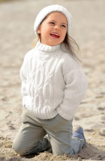 Белый свитер и шапочка спицами для девочки