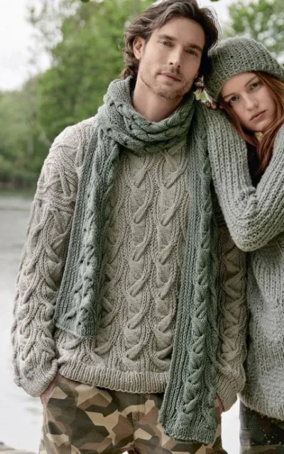ВАМ ПОТРЕБУЕТСЯ Пряжа (45% натуральной шерсти, 40% хлопка, 15% кашемира; 105 м/50 г) – для джемпера 750 (800) г серо-бежевой, для шарфа 350 г серо-зеленой; спицы № 4,5 и 5,5; круговые спицы № 4,5.