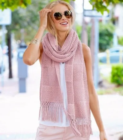 Короткие края шарфа декорировать бахромой, прикрепив за сгиб по 3 нити длиной по 40 см через каждые 3 п.