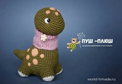 8 ряд: вяжем по кругу 60 сбн: 2 сбн по животику, потом обвязываем лапку – 12 сбн, 2 сбн по животику, снова обвязываем лапку динозавра – 12 сбн, 4 сбн по длинной стороне овала (по животику), по лапке 12 сбн, 2 сбн по животику, 12 сбн по лапке и 2 сбн по животику.