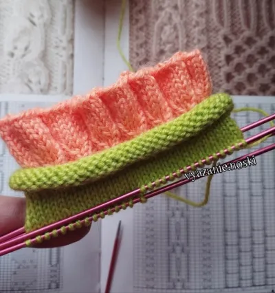 Для начала вязания следует рассчитать количество набора петель. Для начала следует набрать вдвое больше петель, их число должно обязательно быть кратно двум. Например, для вязания носков вам нужно набрать 60 петель, удваиваем количество и набираем на спицы 120 петель + 1 петлю для замыкания вязания в круг. Соединив петли и распределив их на 4 спицы следует провязать 5 рядов чередуя 2 изнаночные и 6 лицевых. После этого начинаем убавлять лицевые петли. Вяжем 2 изнаночные, 2 лицевые вместе с наклоном влево, 2 лицевые, 2 лицевые с наклоном вправо. Следующий ряд следует провязать по рисунку: лицевые над лицевыми, изнаночные над изнаночными. Далее провязать ряд с сокращениями: 2 изнаночные, 2 лицевые вместе с наклоном влево, 2 лицевые вместе с наклоном вправо. После окончания ряда на спицах остается нужное для носков количество петель узором резинка 2*2. Провязав резинкой 3 ряда оставляем на время работу и переходим к вывязыванию валика. Для этого набрать необходимое количество петель и провязать лицевой гладью 10 рядов, после чего следует совместить рюши и валик и провязать по 2 петли вместе( по 1 с каждой части). Провязав соединительный ряд продолжайте вязание носка выбранным узором.
