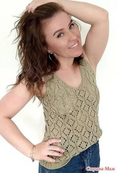 И комментарий из источника: Я в восторге!!! Не любила летнее вязание, а зря) Тонкие лямки и ажур на всем полотне пропускают воздух и в этой майке очень комфортно в жару. А еще её отлично можно носить под кардиган или жакет в офис круглый год. Главное работы здесь на 3-4 вечера, обожаю такие процессы.