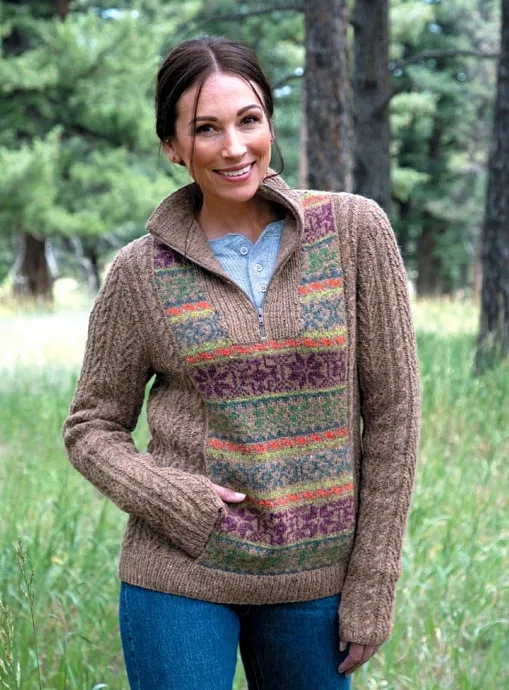 Этот пуловер вяжется поворотными рядами, снизу вверх, отдельными деталями и затем сшивается. После того, как выполнены плечевые швы, поднимаются петли по центру передней части, и по отдельности вяжутся левая и правая планки до края горловины. Затем петли планки соединяются с петлями горловины сзади, и резинкой вяжется воротник. Лицевая сторона воротника вяжется лицевой гладью до края горловины. Петли горловины спинки закрываются, а планки вяжутся отдельно вплоть до отверстия спереди.