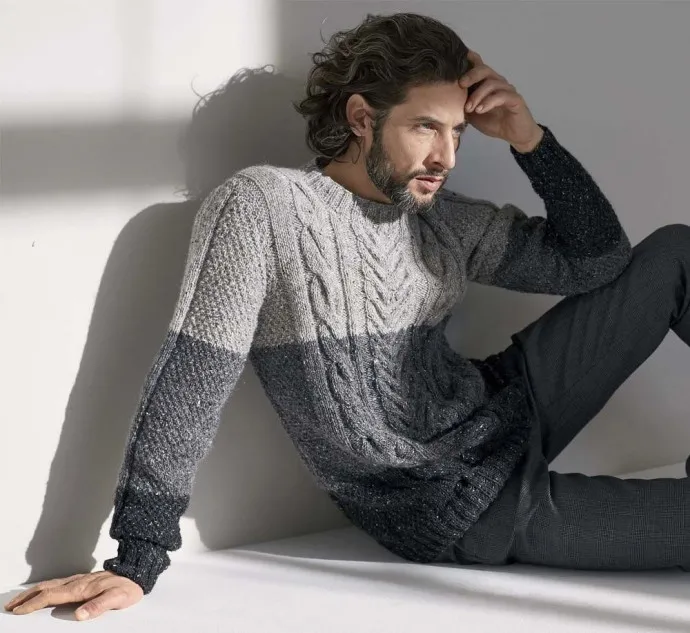 Твидовая пряжа (70% овечьей шерсти, 30% мохера; ок. 110 м/ 50 г) — 250 (300) 350 г = 5 (6) 6 мотков серой, по 200 (250) 250 г = по 4 (5) 5 мотков темно-серой и серебристой; спицы №4,5 и 5; круговые спицы №4,5; вспомогательная спица для вязания «кос».