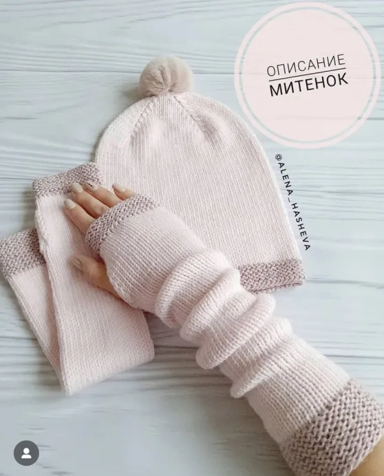- Набрать на спицы 3.5мм 36п+1п для соединения в круг. Вяжем 5см (10р) платочной вязкой, далее переходим на спицы 4мм и лицевую гладь. Вяжем 28см(80р). Затем для отверстия для большого пальца провязать 5 см рядами в прямом и обратном направлении, при этом кромочные петли выполнять как узелковый край. Теперь снова замкнуть работу в кольцо и провязать еще 1-2см лицевой гладью круговыми рядами. Далее перейти на спицы 3.5 и вязать платочной вязкой ещё 3см(6р).