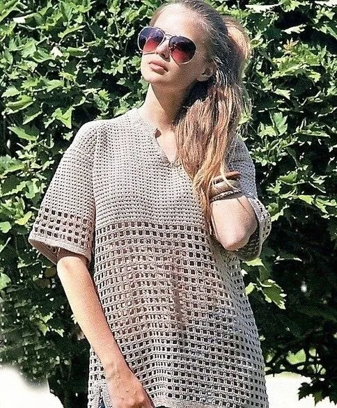 Связать в высоту 4 квадрата и для боковых разрезов с каждой стороны добавить 5 воздушных петель (1 клетка). Всего в высоту от наборного края связать 22 квадрата, продолжить вязание маленькими квадратами (5-й, 6-й ряды).