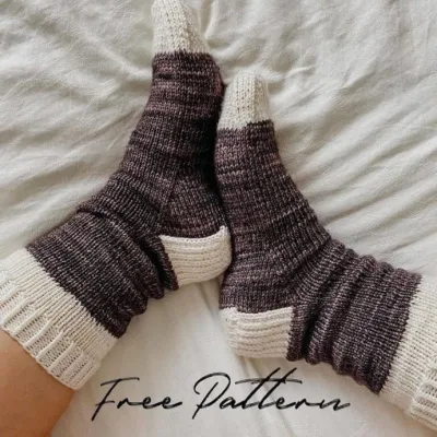 Далее вяжем лицевой гладью по кругу 12 рядов белым цветом и 38 рядов фиолетовым. (Приблизительная длина ~ 14 см от резинки до начала пятки). Нить не обрывать!!⠀