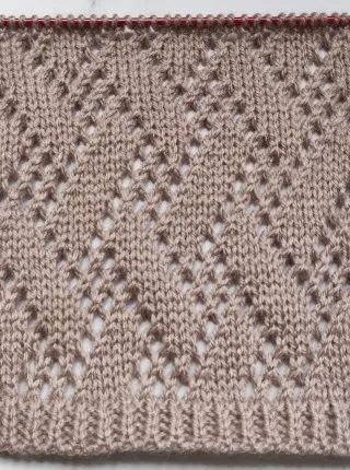 19-й ряд: кром. п., 5 лиц. п., * 3 х (накид, 2 п. вместе лиц. протяжкой), 4 лиц. п., повторять от * до последних 7 п., 3 х (накид, 2 п. вместе лиц. протяжкой), кром. п.