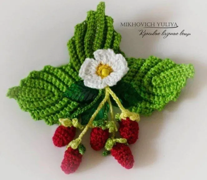 По этой схеме пряжей Коко зеленого цвета вяжем три листика. Можно использовать и меланжевую пряжу или пряжу близких оттенков зеленого, тогда листики будут выглядеть объемнее и походить на настоящие ягодные листы.