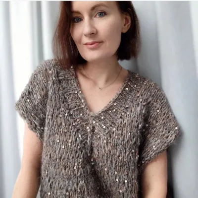 В каждом ряду будем делать двойную убавку, провязывая три центральные петли V-выреза вместе лицевой, таким образом, что центральная лицевая петля должна быть накинута на две лицевые провязанные вместе, чтобы сформировать аккуратные убавки. Петли для резинки необходимо распределить таким образом, чтобы в центре V-выреза была 1 лицевая петля и в обе стороны от неё узор был симметричным. Убавки делаем с первого ряда резинки. Вяжем 9 рядов резинкой. Петли закрываем (здесь тоже делаем убавку) в V-вырезе свободно, на спинке - немного подтягивая нить. Заправляем все концы с изнаночной стороны. Проводим ВТО. Сушим горизонтально.