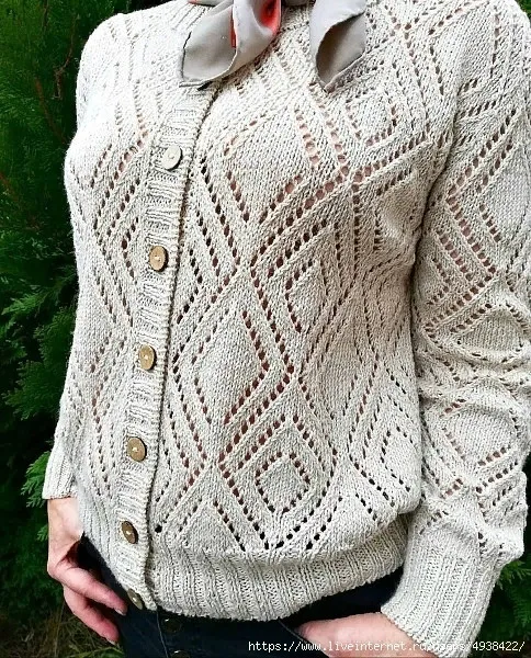Далее в 33-ом ЛР переходим на спицы 3 мм и начинаем вязать ажурный узор «Ромбы», это 5 раппортов узора по ширине плюс 2 кром. (23п. раппорта*5+2п.=117п.) и вяжем узором до пройм 80 рядов (два раппорта узора в высоту) или 26 см. Всего с резинкой вяжем 112 рядов или 34см.