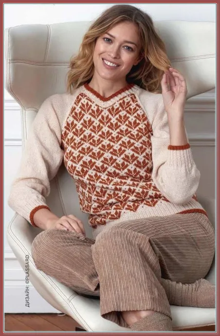 Пуловер выполнен из чистошерстяной пряжи, соединяющих два благородных оттенка – светлый беж и темно-оранжевый. Линии реглана подчеркнуты фантазийной резинкой, так же оформлены низ изделия и планка V-образной горловины