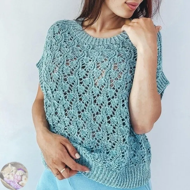 Если вы мечтаете о легком и женственном образе на лето, обратите внимание на вязаную спицами блузу с коротким рукавом. Особенно выигрышно смотрится нежно-голубой оттенок — он освежает, подчёркивает загар и идеально сочетается с летними образами.