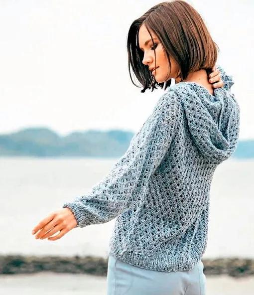 Ажурный пуловер с капюшоном связан спицами сетчатым узором из светло- голубого хлопка с шелком.
